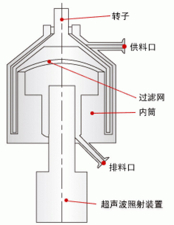 其特点:即通过旋转的转子作用将大比重的分散介质按半径方向循环运动,同时通过转子内部的网状分离装置,将分散的分散液在受到短时间超声波照射后排出。