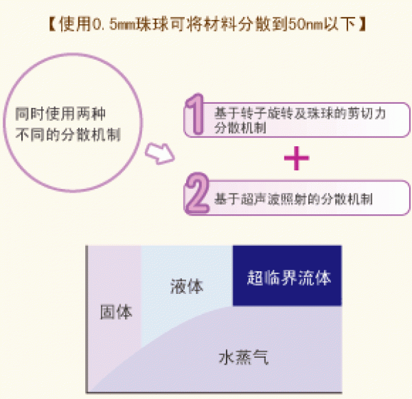 分散装置同时使用了砂磨机的剪切冲击力和超声波的谐振破坏冲击力两种不同的分散机制。
