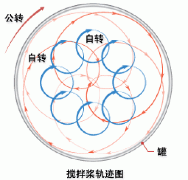 2根扭曲桨进行行星运动产生强力的混练搅拌效果和高速搅拌机产生的高剪切力形成一体达到混练、混合的搅拌机。