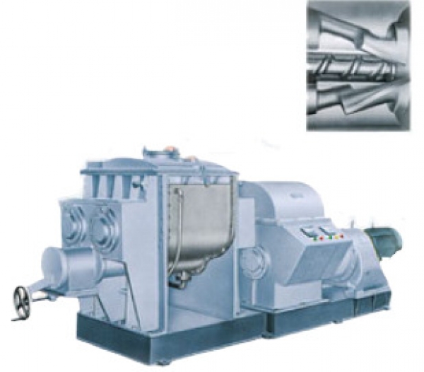 固定形式的3个捏和槽内,搅拌桨和螺旋桨同时运转进行高粘度物质的混练,捏合,分散作业,进行材料的均质加工。