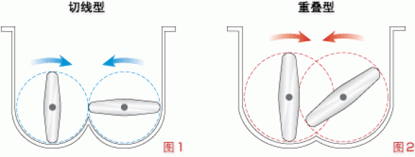 ■切线形式如图1所示两根搅拌桨的运动轨迹呈不相撞排列。所以搅拌桨的形状和转速比可任意设定。此种排列多用于超高粘性物质的捏合。