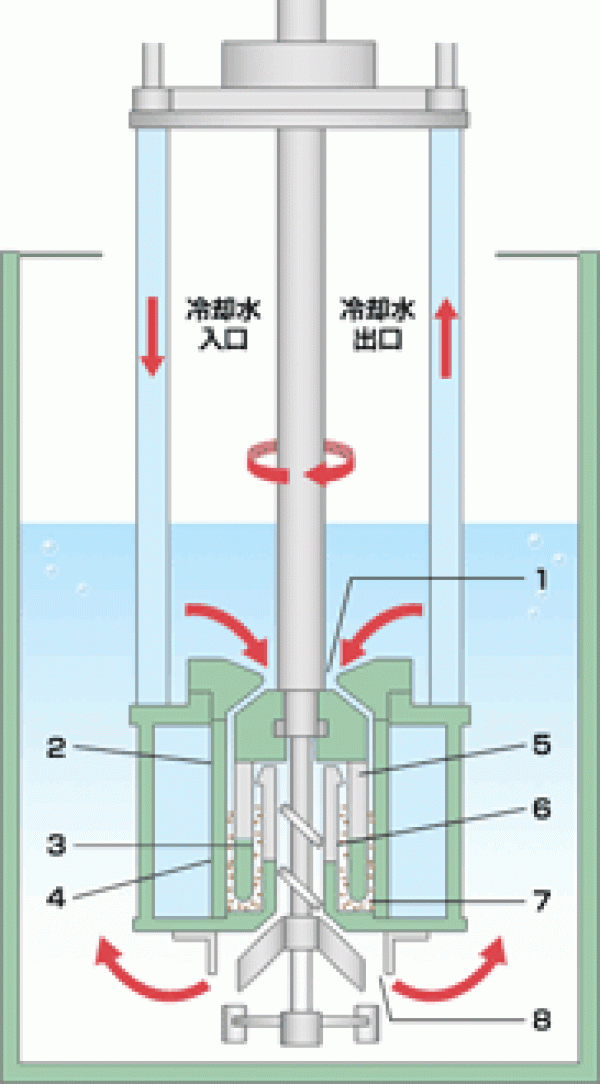 它采用环形转子可得到合适的线速度,可变速为标准式样。可在1~14m/Sec的区间将最合适能量的环状运动赋予粘稠溶液及珠球。在珠球分离方式上它采用吐出面积较大的网状分离。且由于是大流量自己循环方式,所以珠球的直径从0.5mm~1.0mm的各种珠球(玻璃珠、氧化铝珠球、钛珠球、氧化锆珠球等)均可使用。充填量为内筒分散领域容量的80~90%。