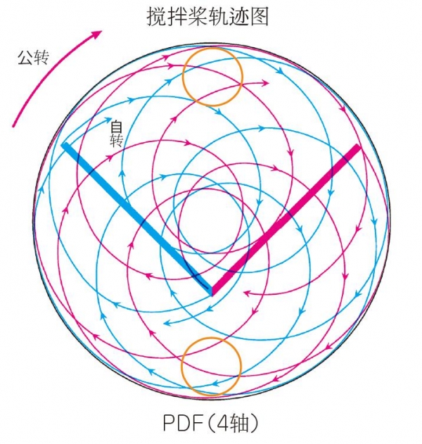 由自转、公转2根扭曲框型桨(90°扭曲)和与此自转、公转运动同时自转的两根高速涡轮搅拌桨构成的四轴行星运动旋转,实现搅拌罐内无死点均一的搅拌、混炼、分散。