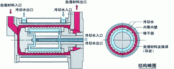 它是在由内筒及转子构成的双重圆筒间隙(环状)部分,由转子驱动珠球实现粉碎、剪切、磨碎作用的环状、湿式砂磨机。