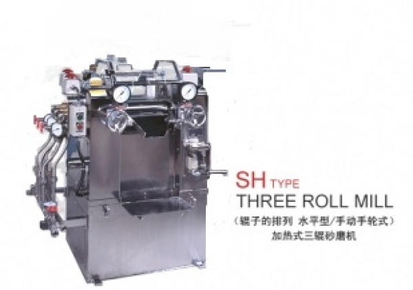 SH:高功率加热型,加压方式为手动旋转手柄式的三辊研磨机。 由转速不同的三根研磨辊构成,适用于处理中~高粘度材料的分散机。