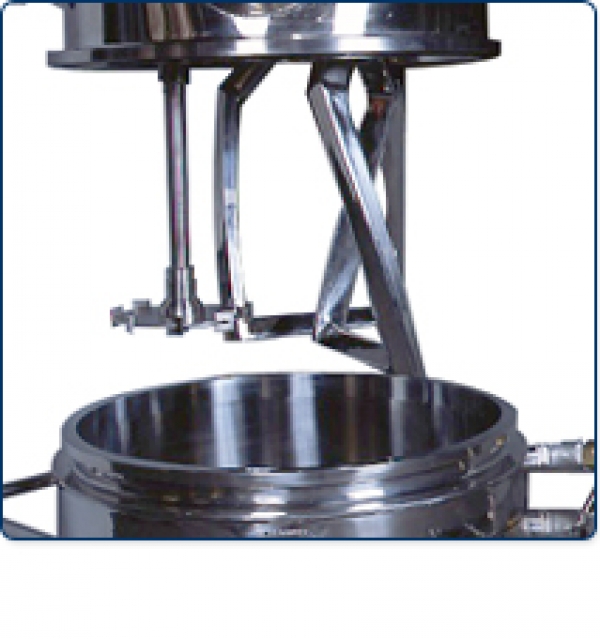 Compared with horizontal kneaders which support both ends of a horizontal shaft, the INOUE PD MIXER supports the top end of a vertical blade shaft. This construction facilitates cleaning, and the interchangeable tank ensures safety.