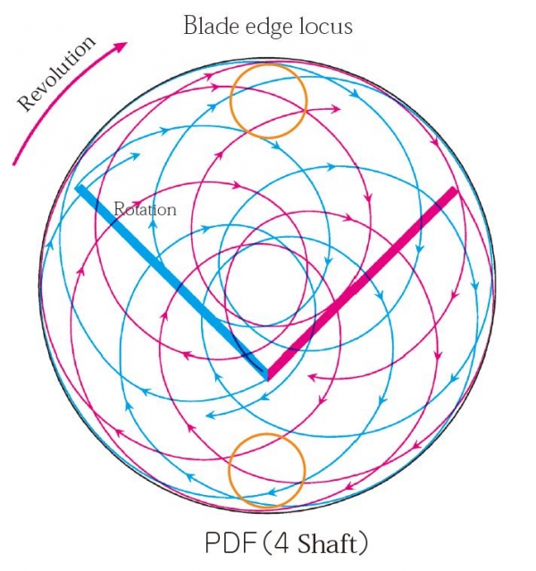 The pair of twisted open type blades (90°twisted) and the system is composed of four axes of planetary motion rotation with two high-speed turbine blades that rotate in synchronization with the rotation and orbital motion, enabling even agitation, kneading, and dispersion in the tank without dead space.