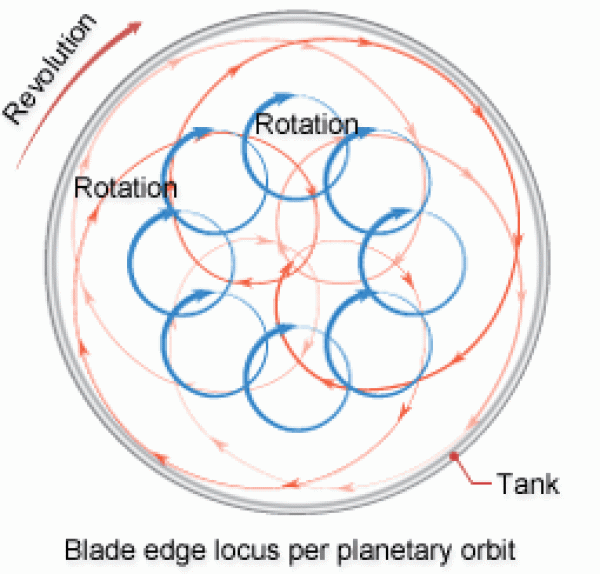 The pair of twisted open type blades (45°or 90°twist) and the high-speed turbine blade rotates on their own axis as well as in a planetary orbit. These planetary movements result in the supreme efficiency and uniformity of mixing, kneading, and dispersion.