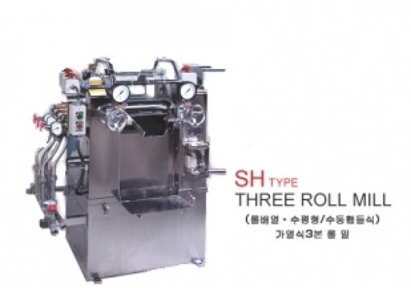 가열 사양의 고마력형으로 가압방식이 수동 핸들식의 3Roll Mill.회전수가 다른 3개의 Roll으로 구성되어 중~고점도 재료의 처리에 적합한 분산기