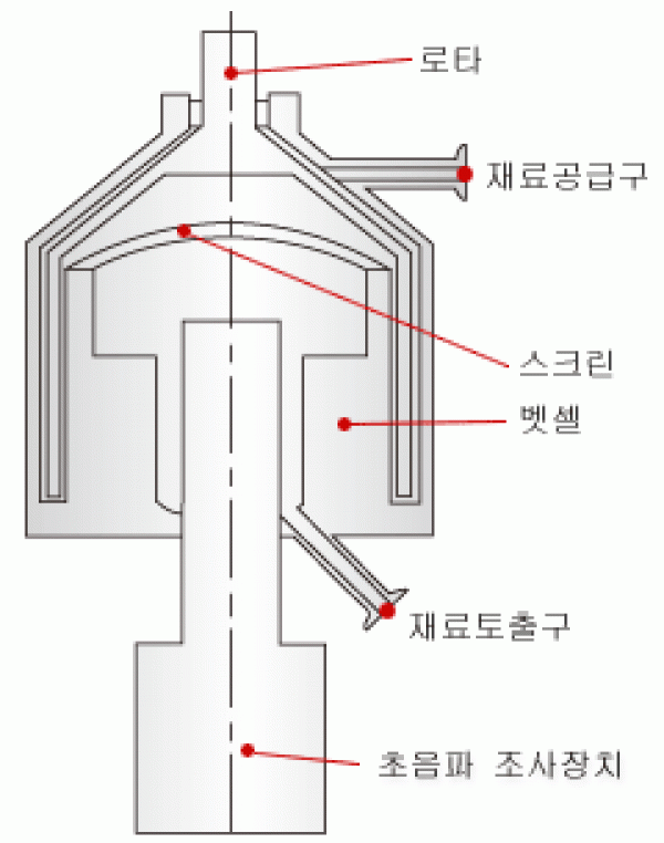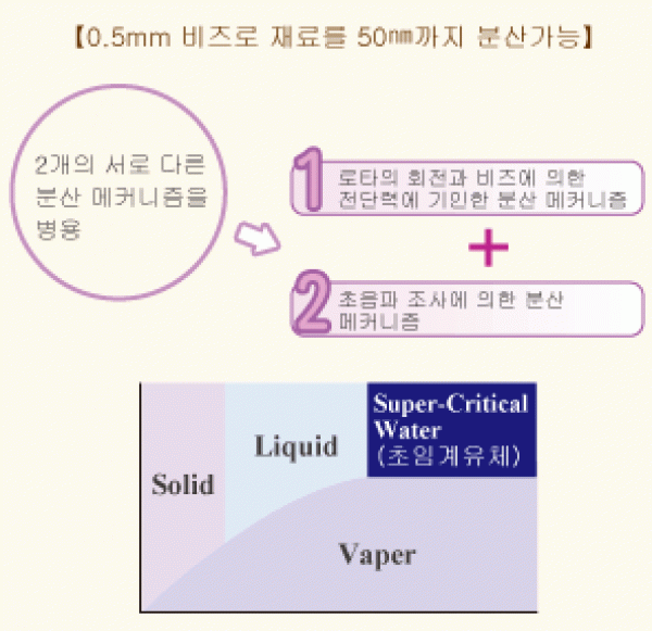 즉, 회전하는 로타에 의해 비중이 큰 비즈(분산매체)는 반경방향으로 순환운동을 전달하여 슬러리를 분산시키고 이와 동시에 로타 내부에 장착된 분리 스크린 장치를 통과한 슬러리는 단시간에 초음파조사를 받아 배출되는 것이 특징입니다.