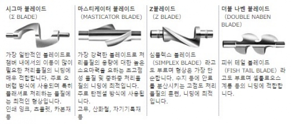 블레이드의 형상에도 다양한 종류가 있습니다. 처리물질의 성질 및 점도 등을 고려해서 최적의 블레이드를 선정합니다.