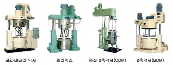 람 프레스 사용의 전공정 기계로는 고점도 물질의 교반・혼련・분산용 플라네타리 믹서, 트리믹스, 동심 2축 믹서(CDM), 2축 믹서(BDM) 등이 있습니다.