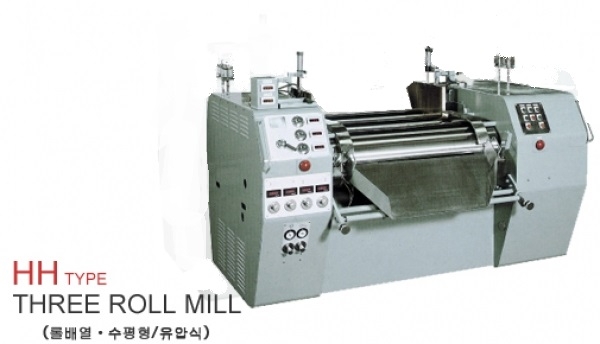 Roll의 재질이 칠드(금속) 사양으로 가압방식이 유압식의 수평형 3Roll Mill. 회전수가 다른 3개의 Roll으로 구성되어 중~고점도 재료의 처리에 적합한 분산기