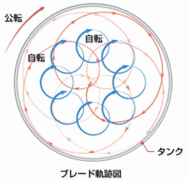 自転・公転する2本の捩れ枠型ブレード(45°捩れ又は90°捩れ)と、この自転・公転運動と同期しながら自転する高速タービンブレードの3軸の遊星運動回転で構成され、タンク内をデッドスペースなく均一に攪拌・混練・分散が可能です。