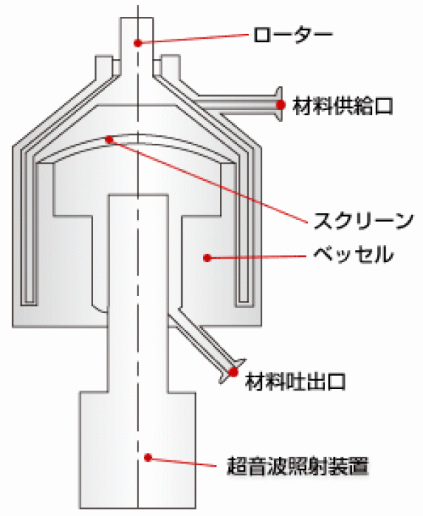 ローターの表面に特殊な突起形状を設け、開口した中空の筒型形状です。 筒型部分には、分散媒体循環のための、複数の循環孔を設け、ローターの中空内部には、分散媒体とスラリーの分離装置及び超音波照射装置を備えています。 分散機構は、ビーズミルの剪断・衝撃力と超音波によるキャビティの破壊衝撃力の二つの異なる分散メカニズムの併用です。 即ち、回転するローターの作用により、主に比重の大きい分散媒体は半径方向に循環運動を与えると共に、ローターの内部の分離スクリーン装置を介して分散されたスラリーは、短時間超音波照射を受けて排出されることを特徴としている。