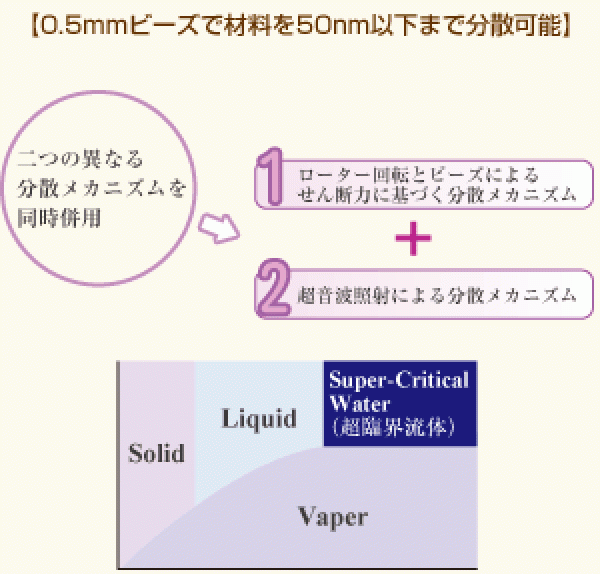 良好な分散スラリーを得る場合、①漏れ ②微細化 ③安定性の三要因を満足させる必要があります。微細化時(②)の影響で再凝集により、諸物性を低下させることもありますが、ソフト分散が可能で、超音波照射効果と相俟って、濡れ性向上で貯蔵安定性に寄与します。