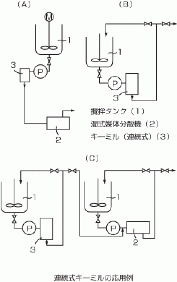 連続式キーミルは、ジャケットを装備したベッセルとローターから構成された二重円筒の間隙(環状)部において、ローターの回転でスラリー溶液とビーズに環状運動を与え、ローターの表面にある特殊な突起物の作用により、粉砕・剪断・磨砕を行わせます。連続式キーミルはスラリー溶液タンクとパイプラインで接続されたパイプラインビーズミルです。応用例は図に示します。