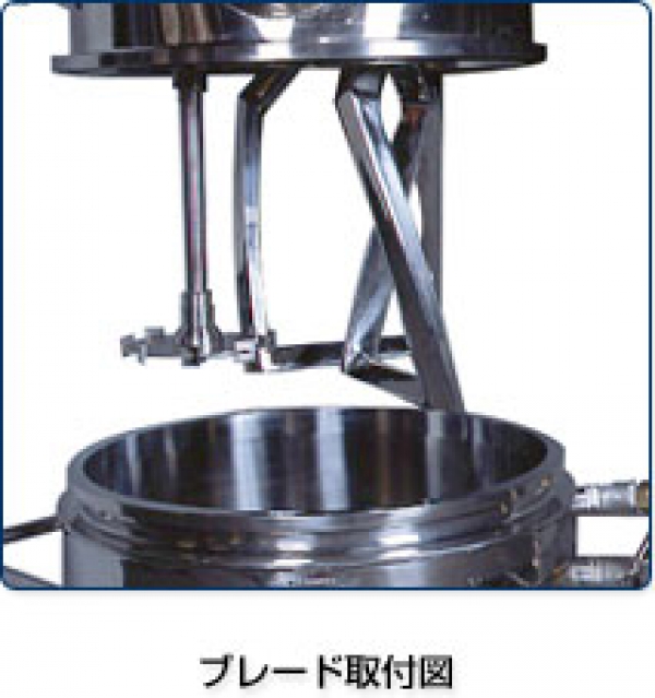 ブレード軸は片持ち(竪型)である為、横型のニーダー等の両持ちと比べて軸部の清掃は非常に簡易であり、タンクも交換式ですので清掃の安全性もはかれます。