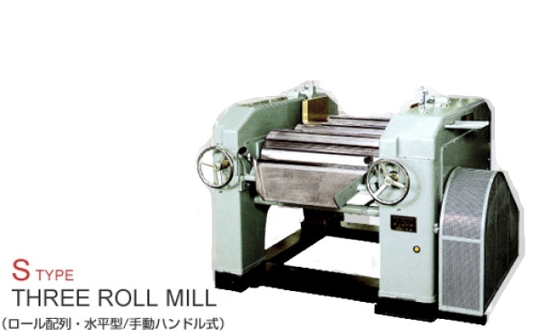 ロールの材質がチルド(金属)仕様で加圧方式が手動ハンドル式の水平型三本ロールミル。回転数の異なる3本のロールから構成され、中~高粘度材料の処理に適した分散機。