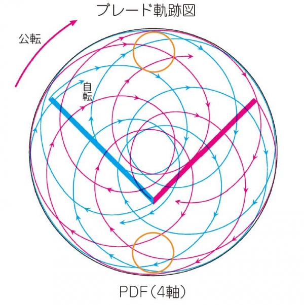 自自転・公転する2本の捩れ枠型ブレード(90°ネジレ)と、この自転・公転運動と同期しながら自転する2本の高速タービンブレードの計4軸の遊星運動回転で構成され、タンク内をデッドスペースなく均一に撹拌・混練・分散が可能です。
