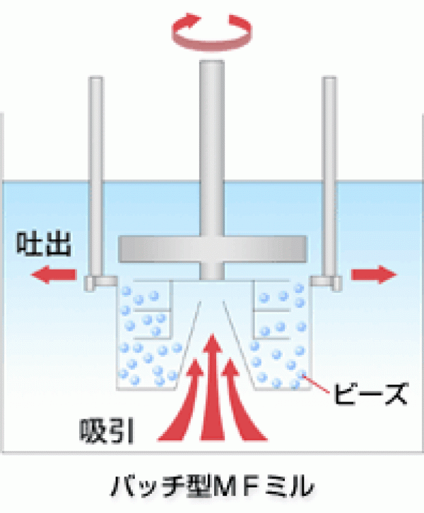 エムエフミルは、分散室(ベッセル)内の分散媒体(ビーズ)が高いシェアーで処理材料を分散する機能と、処理材料を吸引する機能を兼備した遠心ポンプ機能(自己吸引型ディスク)の相乗効果により、処理材料の吸引量を増やし、従来機に比べて分散ゾーンの循環回数を大幅に増大し、分散時間の短縮を可能にしたバッチ型媒体分散機です。